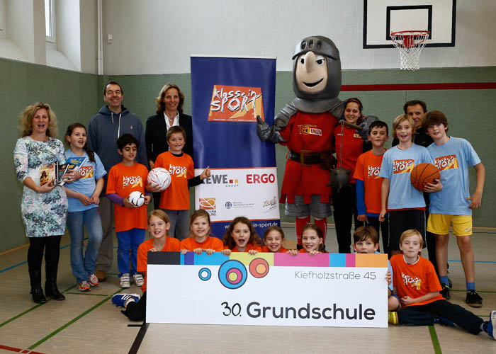 Riesenfreude in der Grundschule 09G30 an der Kiefholzstrasse in Berlin: Schulleiterin Claudia Vogt mit ihren Kolleginnen Susanne Kottke und Chrico Cutino freuen sich über den Startschuss zum Projekt „Klasse in Sport (KiS)“. Die Treptower Grundschule ist eine von zehn Schulen, die von der Bundesliga-Stiftung finanziert wird. Kooperationspartner ist der 1. FC Union Berlin, der mit Dr. Cornelia Laudamus, Lutz Munack und Spieler Eroll Zejnullahu direkt mit von der Partie waren. Unions Mädchen-Trainerin Anja Matthes übernimmt auch die Durchführung der KiS-AGs vor Ort in der Schule. Gemeinsam mit Union-Maskottchen „Ritter Keule“ packten auch die zahlreichen AG-Kinder gesapnnt die Materialien aus, die von KiS zur Verfügung gestellt werden und probierten sie gleich mal aus. Für die anschließende „Bewegung im Kopf“ sorgte Autor Boris Pfeiffer (u. a. ???-Kids, Das Wilde Pack, Unsichtbar und trotzdem da). Der Ur-Berliner überreichte der Schule auch gleich ein paar Abenteuer-Bücher für ihre Bibliothek.