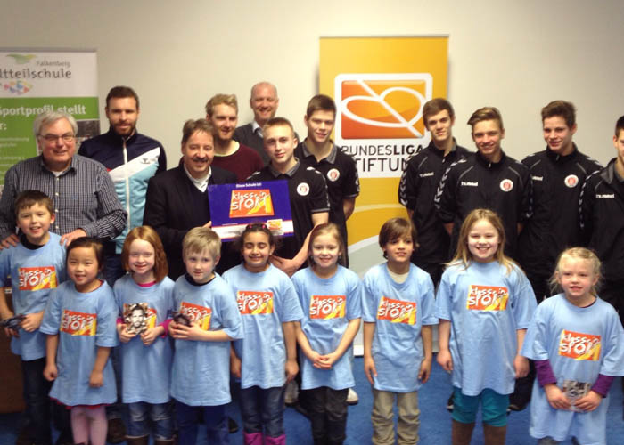 Die Schulsportinitiative Klasse in Sport e. V. (KiS) und die Bundesliga-Stiftung (BLS) haben an einen weiteren Startschuss für eine längerfristige, gemeinsame Zusammenarbeit gegeben. Gemeinsam mit dem FC St. Pauli wird nun der Standort Hamburg auf derzeit 19 Grundschulen erweitert. Bundesweit unterstützt KiS damit zusammen mit anderen Freunden und Förderern wie der REWE-Group, der ERGO Versicherung oder Kandi-Malz insgesamt 84 Schulen. Zur offiziellen Schulschildübergabe im Rahmen dieser Kooperation trafen sich Thorsten Richter (Projektverantwortlicher der Bundesliga-Stiftung), Spieler Markus Thorand und Alexander Eik vom FC St. Pauli, Mathias Bellinghausen (Geschäftsführung vom KiS e.V.) gemeinsam mit Rektor Thomas Grübler und Jens Bendixen-Stach gemeinsam mit Schülern der STS Fischbek-Falkenberg in deren nagelneuen Sporthalle.
