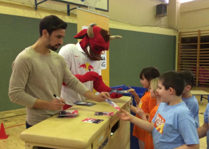 Als erste Leipziger Grundschule nehmen sie unter der Leitung von Sportlehrerin Jana Elger und Torwart-Legende Perry Bräutigam am Projekt „Klasse in Sport“ teil. Finanziell ermöglicht dies die Bundesliga-Stiftung, dessen Vorstandsvorsitzender Stefan Kiefer zusammen mit Ingo Hertzsch, Profi Rani Khedira und Maskottchen Bulli (alle RB Leipzig) der Rektorin Bettina Trummer offiziell das Schulschild von „Klasse in Sport“ übergaben. Natürlich mussten sie auch ordentlich Autogramme schreiben. Khedira verriet den vielen kleinen RB-Fans: „Wir geben uns große Mühe, damit wir in die Bundesliga auftsteigen. Dann spielen wir hier auch gegen Bayern oder den BVB!“