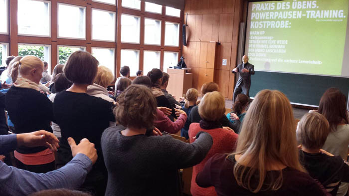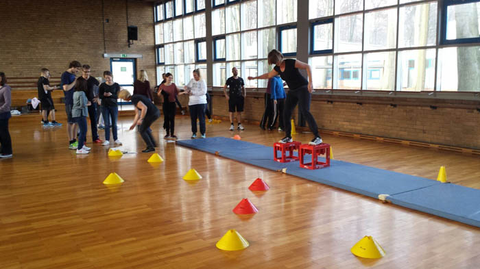 In diesem Schuljahr trafen sich die Kölner Lehrerinnen und Lehrer bereits am ersten Dezember-Wochenende zur alljährlichen Fortbildung in Köln. Doch auch aus Dinslaken, Bochum, Bonn oder Leverkusen kamen die Teilnehmer, die zur Belohnung im Anschluss zum Glühwein im Winterland an der „Playa“ neben der Deutschen Sporthochschule Köln eingeladen wurden. Neben zwei Praxiseinheiten von Sandra Arenz, Christian Tourney und Markus Porr sowie einem Best-Practice Beispiel durch die Dormagener Lehrerinen Frau Ferdinand und Frau Schwandtke (Foto), standen auch eine theoretische Einführung (Dr. Mathias Bellinghausen) und ein „Chronobiologisches Training“ durch Michael Paul Herbst mit viel Bewegung im Hörsaal auf dem Programm (Foto).